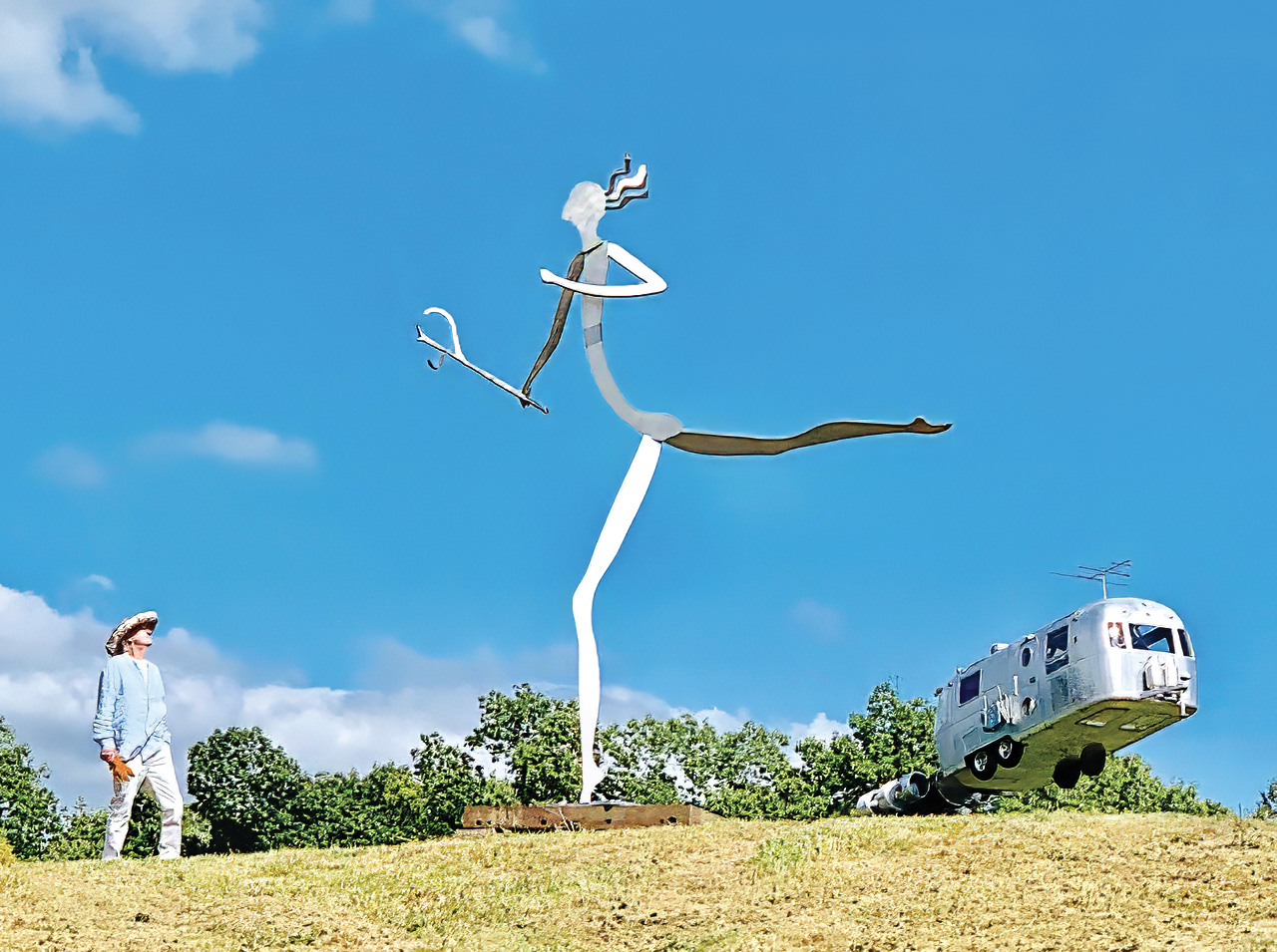 Statistician-sculptor Edward R. Tufte, who goes by ET, enjoys adding whimsy and humor into his sculptures. A fitting example is “Rocket Science,” which measures over 70 feet long and 30+ feet tall. Those with keen eyes will observe lawn chairs attached to one side, a ventilation fan on top that spins with the wind and an old-fashioned TV antenna. Rife with inside jokes, some only known to the artist, this “rocket” even has brakes from a Porsche. “I made up this idea that there’s this crackpot in their backyard who is going to make a rocket that is going to Mars,” says ET.